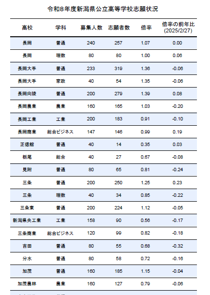 データはこちら⇨2026年 新潟県県央地区 公立高校倍率