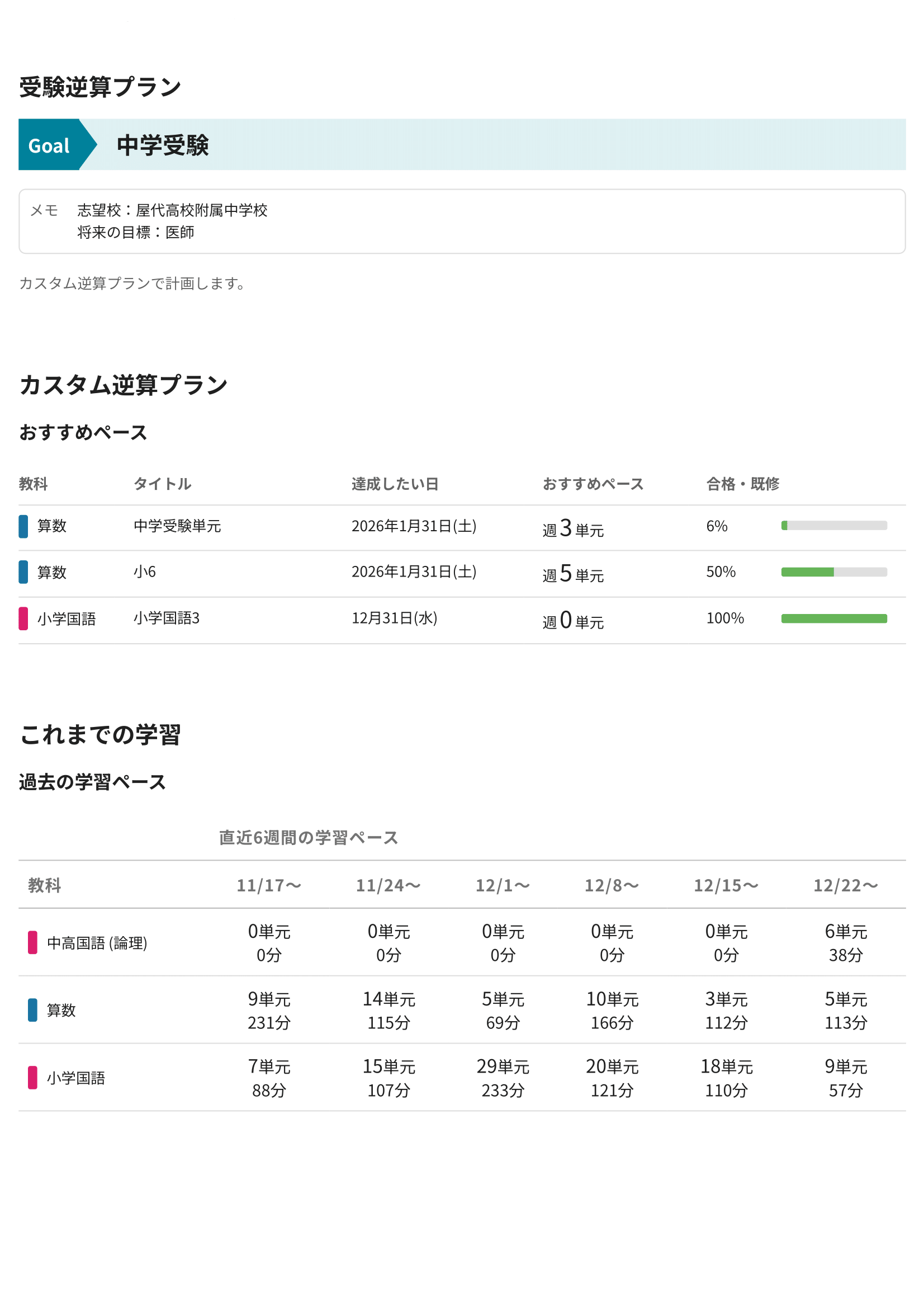 将来の夢の実現(=大学の志望校合格)に向けて、AIが学習の進捗率・理解度・習得までの時間 を見える化。目標の達成度が可視化されることで、自分の成長を実感することができ、やる気の継続に繋がります。