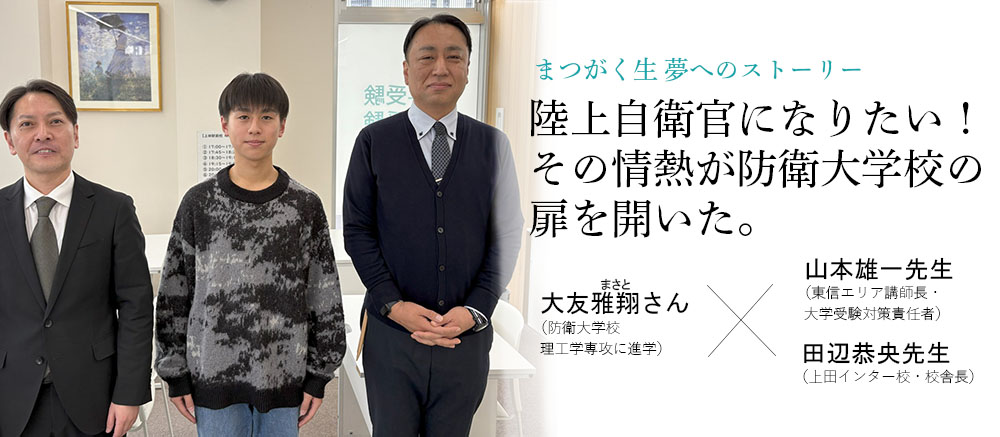 雅翔くんは、中学から6年間ずっと、一生懸命な生徒さんだなと思って見ていました。これからは、いちばんはやっぱり体に気をつけて。自衛官は大変だからね。あとは、国を支えて、災害時に活躍できる自衛官になってほしいですね。節目の時はぜひ、校舎まで来て近況報告を聞かせてください。合格、本当におめでとう!